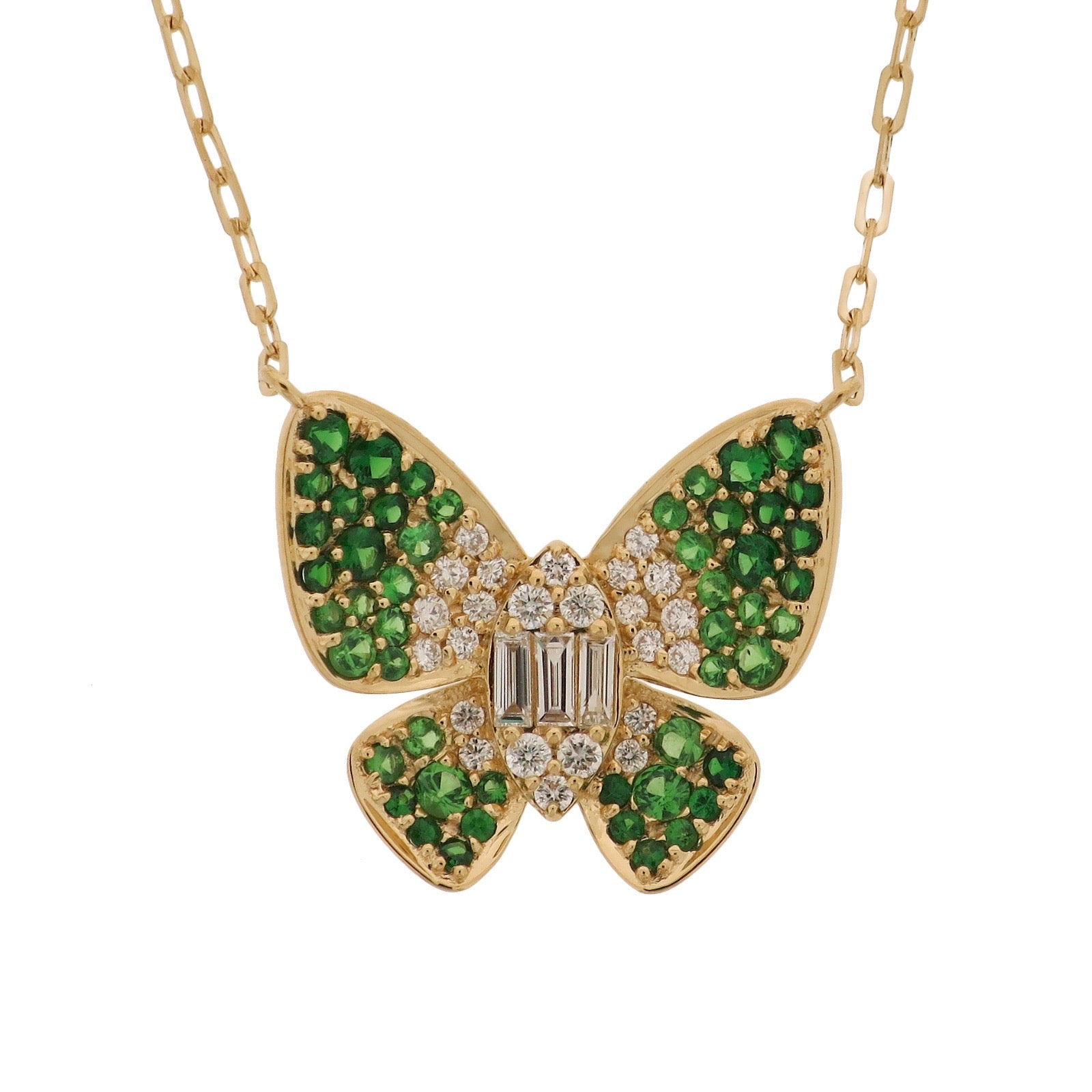A radiant symbol of transformation and elegance, the Emerald Élan Butterfly Necklace is a captivating work of art. Handcrafted in rich 18k yellow gold, this butterfly pendant dazzles with a mosaic of vibrant tsavorite garnets and luminous white diamonds. Each wing is intricately set with a burst of verdant brilliance, while the body glistens with baguette-cut diamonds that echo strength and refinement. A celebration of nature’s beauty and regal grace, this heirloom-worthy piece effortlessly blends timeless charm with modern luxury.