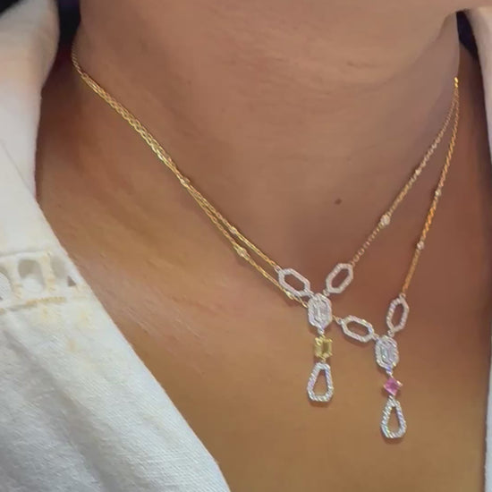 Available in a radiant yellow sapphire and a vivid pink sapphire. Artfully placed at the heart of the piece—like sunbeams and blossoms—symbolizing joy, vitality, and inner royalty. The asymmetrical design adds an avant-garde elegance, making this necklace a regal statement for the modern muse.